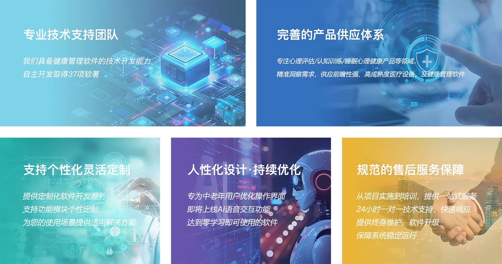 同時我們組建了資深的技術團隊,具備健康管理軟件的技術開發能力,取得37項自主知識產權,覆蓋睡眠健康、兒童青少年、孕產婦、老年心理健康等領域。